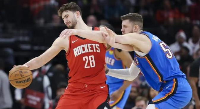 火箭队的申京和亚当斯两人走上球场,肩并肩站在内线,仿佛两座高耸的塔楼矗立在雷霆队面前。